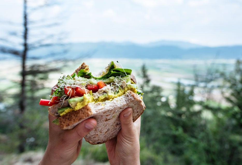 Another meat-free option is found in sandwiches that give complex carbohydrates, healthy fats, and protein for the duration of the hike.
